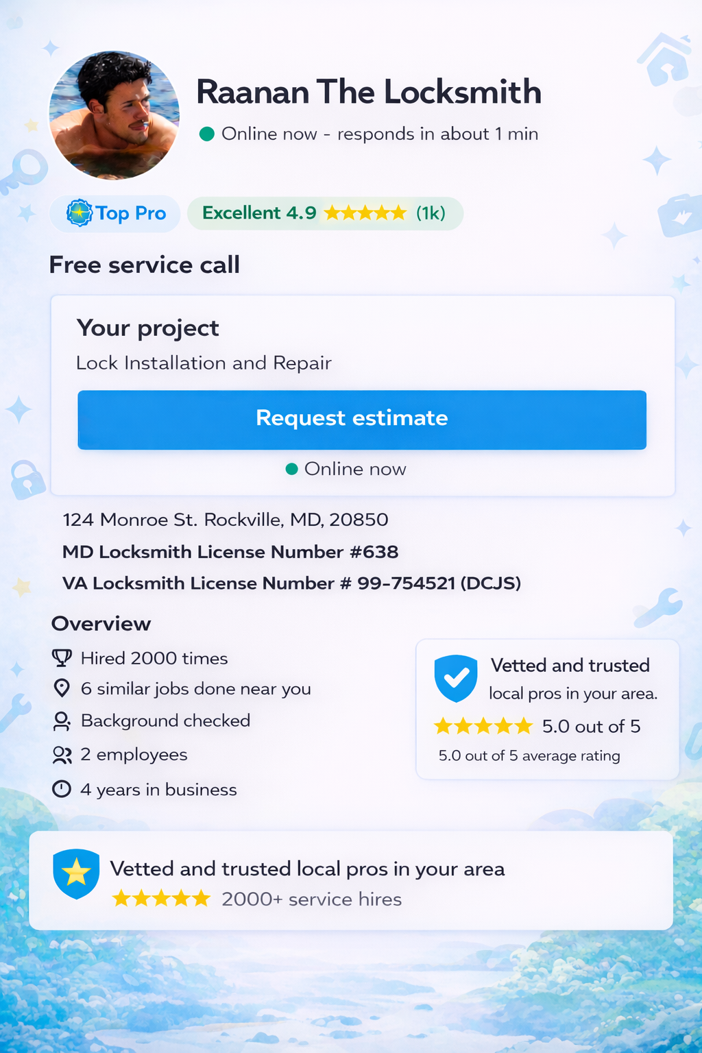 He was on point!!! The best ever with great prices. I used him to rekey several locks in my apartment building. His service was flawless, he was a professional and he was on point. Highly recommend this vendor!!!
